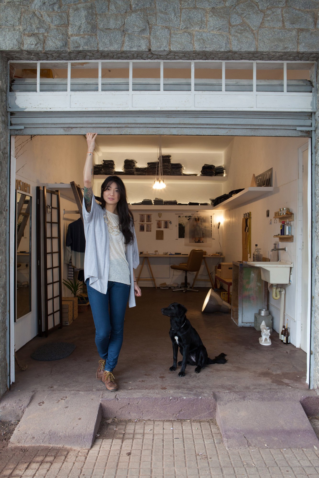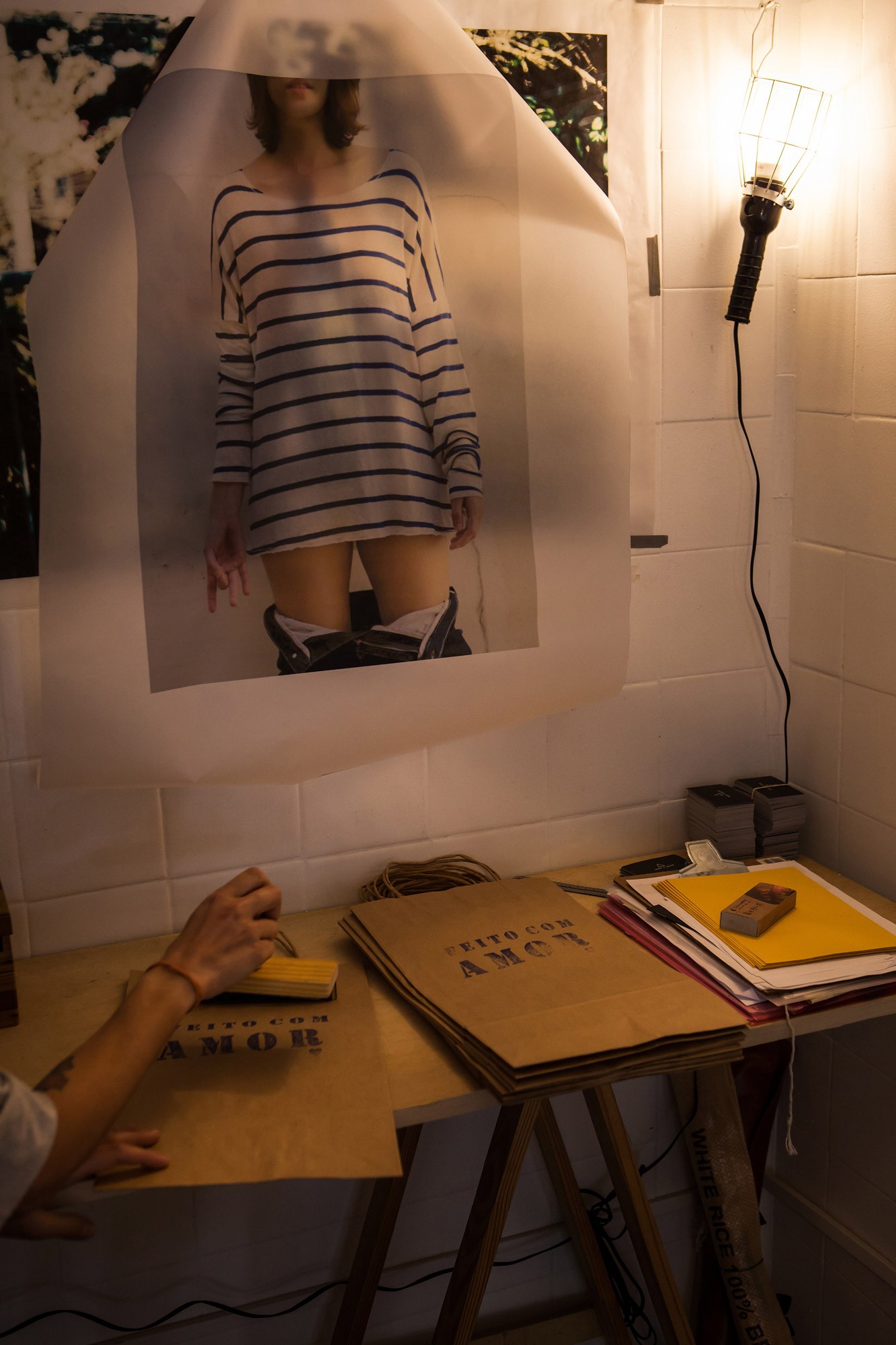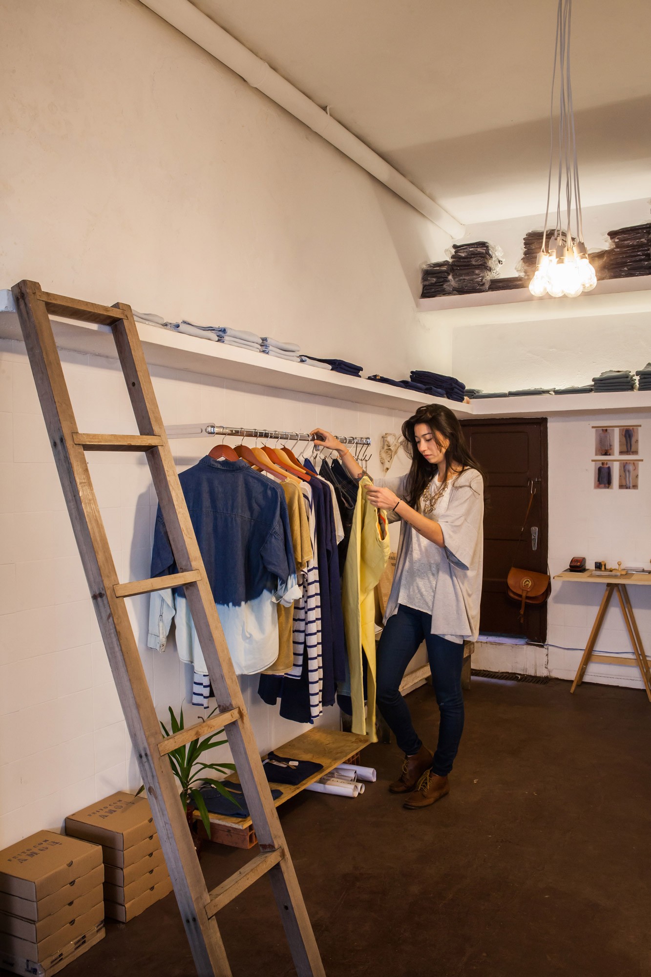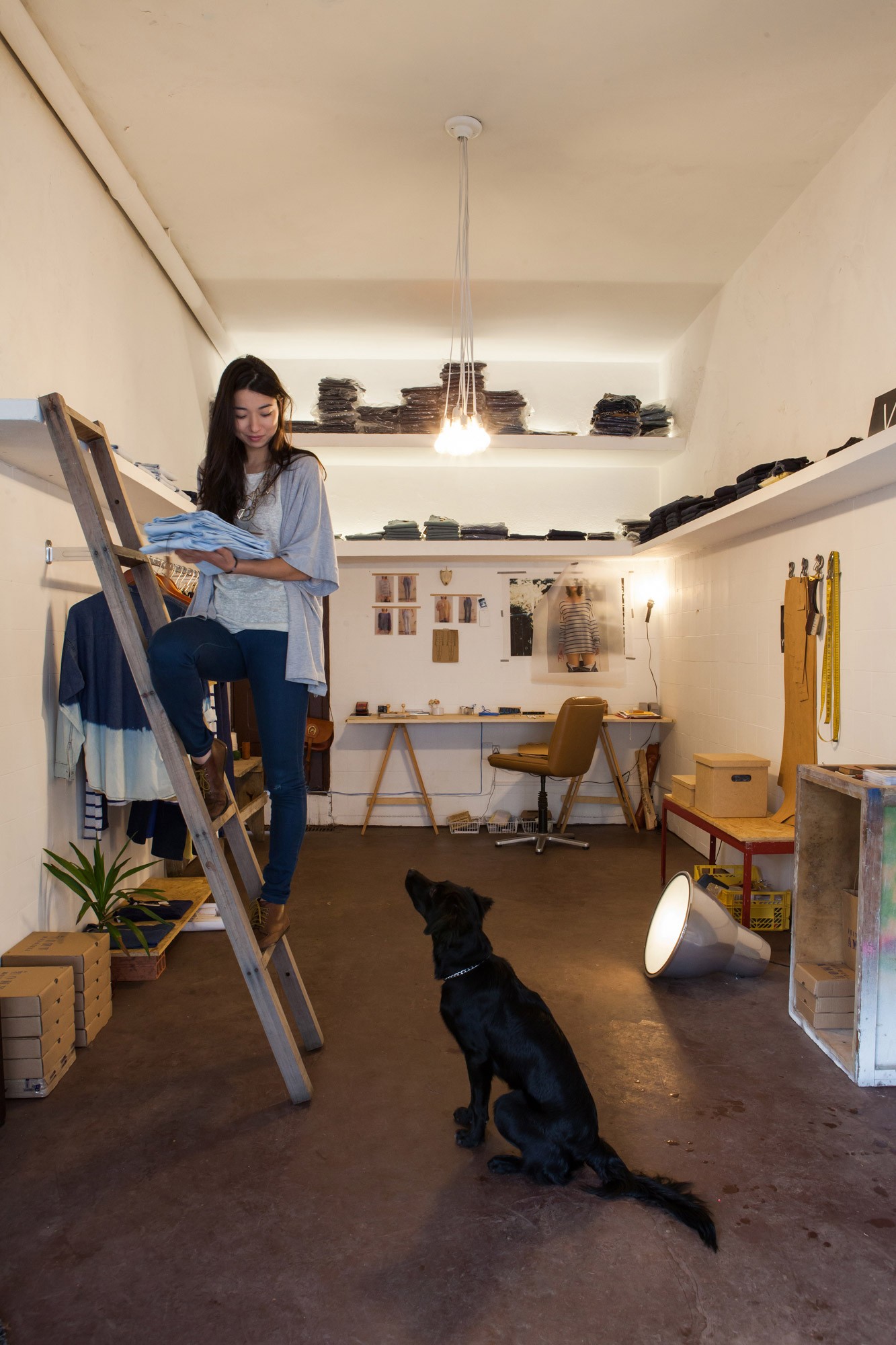 A small, charming studio with exposed wires, boxes, and jeans scattered around. Raquel often sat on the floor cutting fabrics.