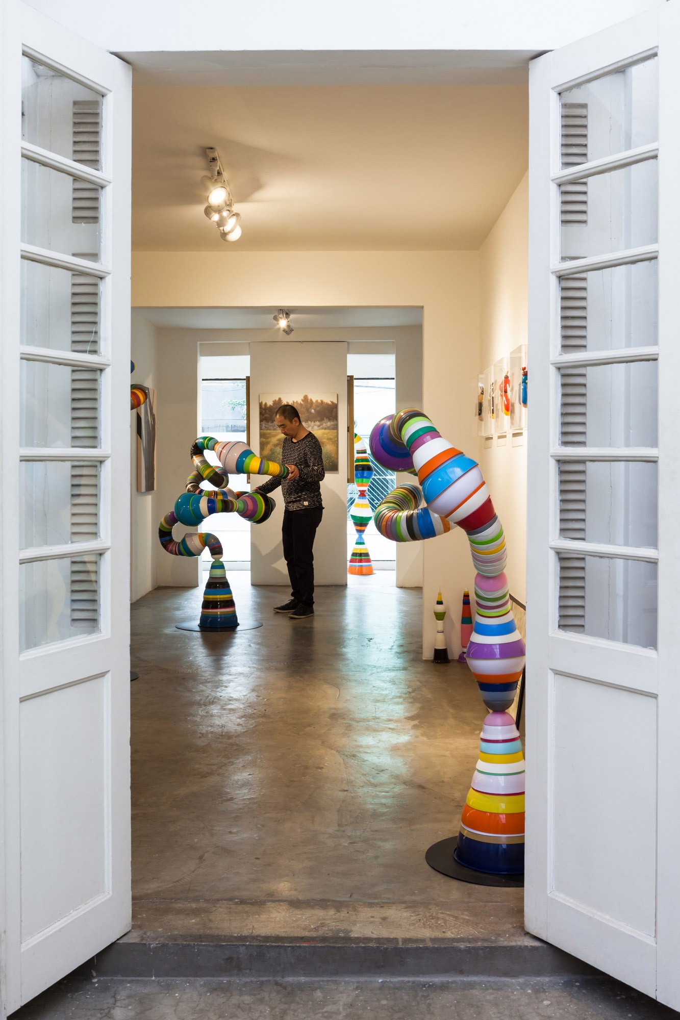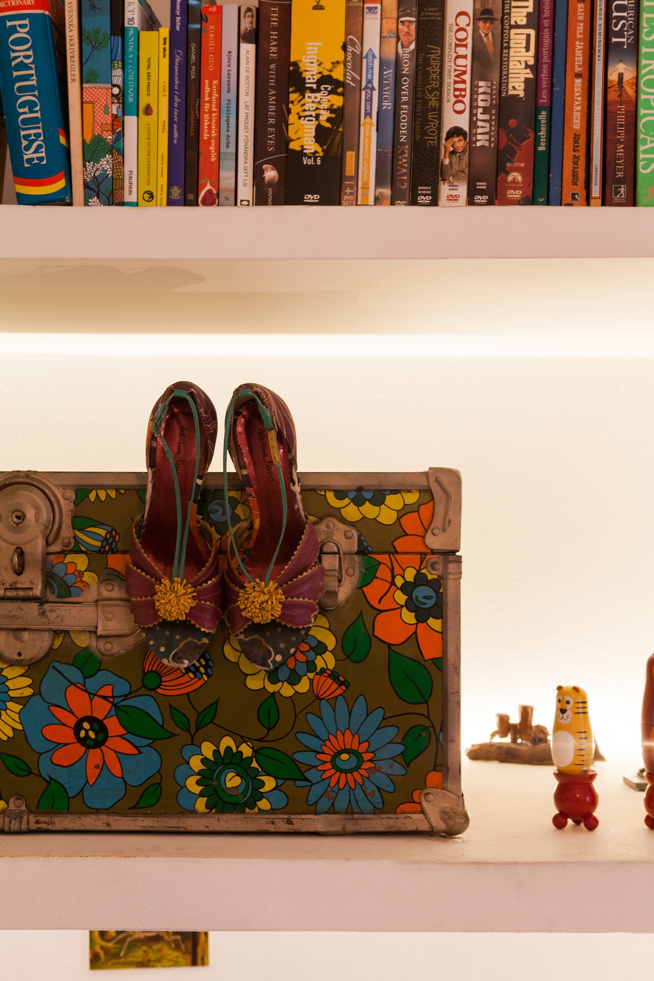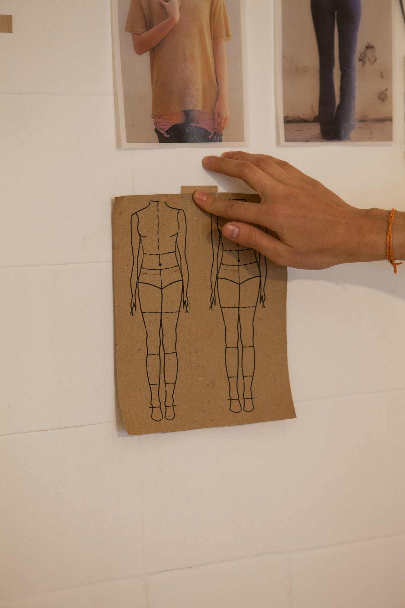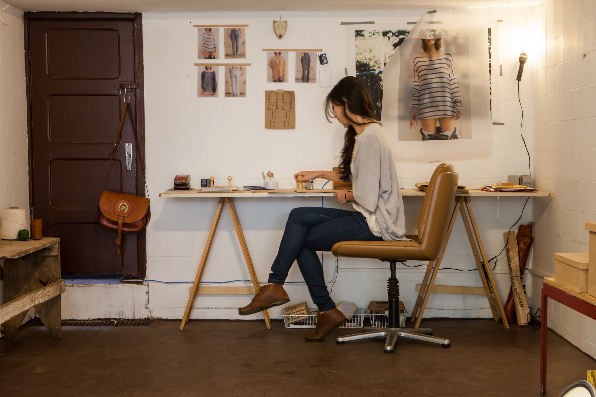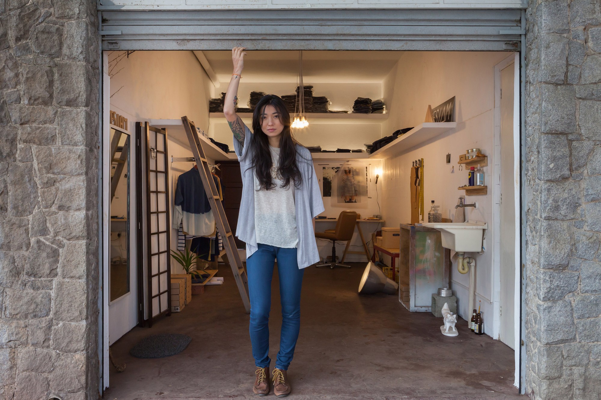 A small, charming studio with exposed wires, boxes, and jeans scattered around. Raquel often sat on the floor cutting fabrics.